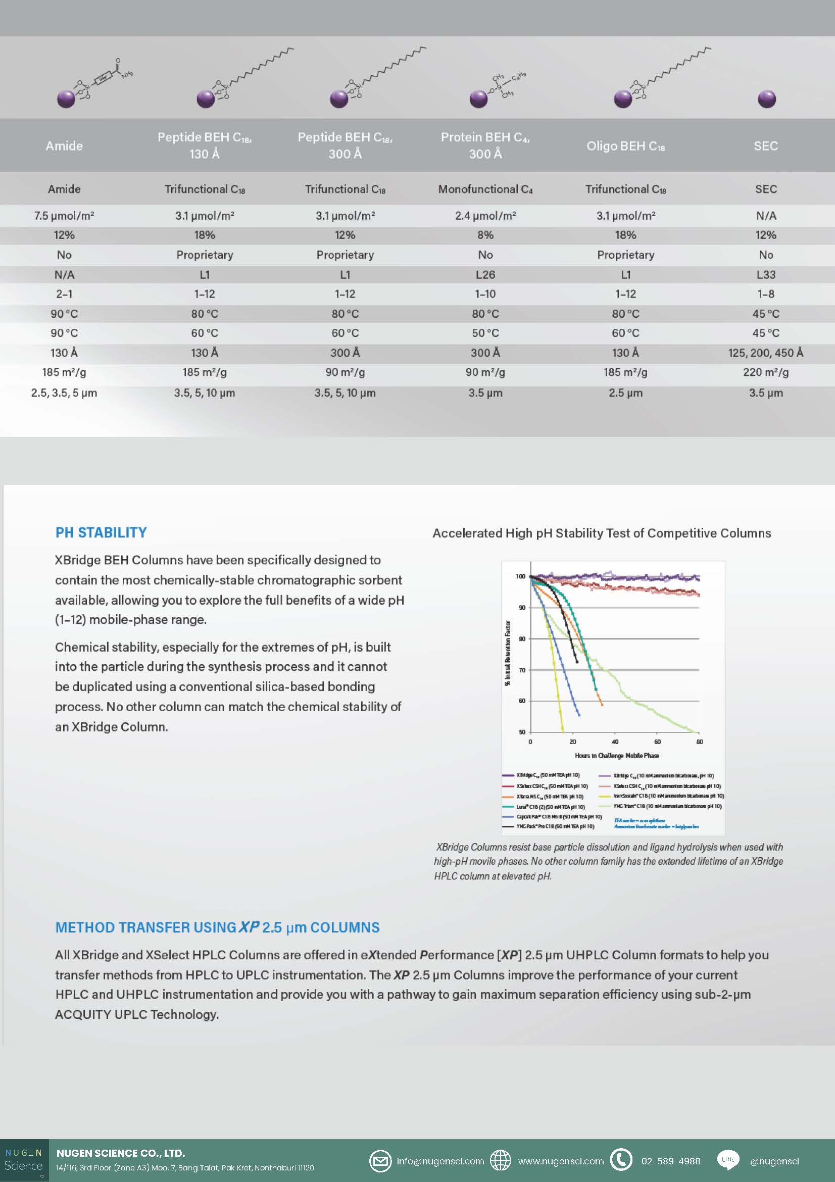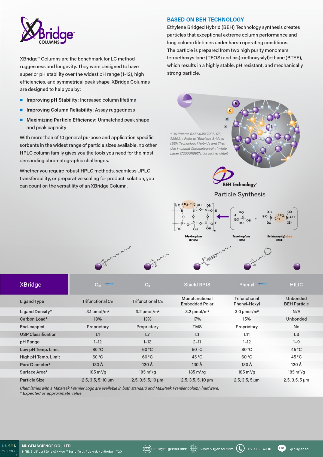 Withstanding extreme operating conditions like high pH and high temperatures is essential for methods development. XBridge HPLC and UHPLC Columns utilize Ethylene Bridged Hybrid (BEH) Particle Technology and are built to withstand high pH, high temperatures, and other extreme operating conditions like volatile eluents, for a wide range of small molecule and biomolecule LC-MS analysis.