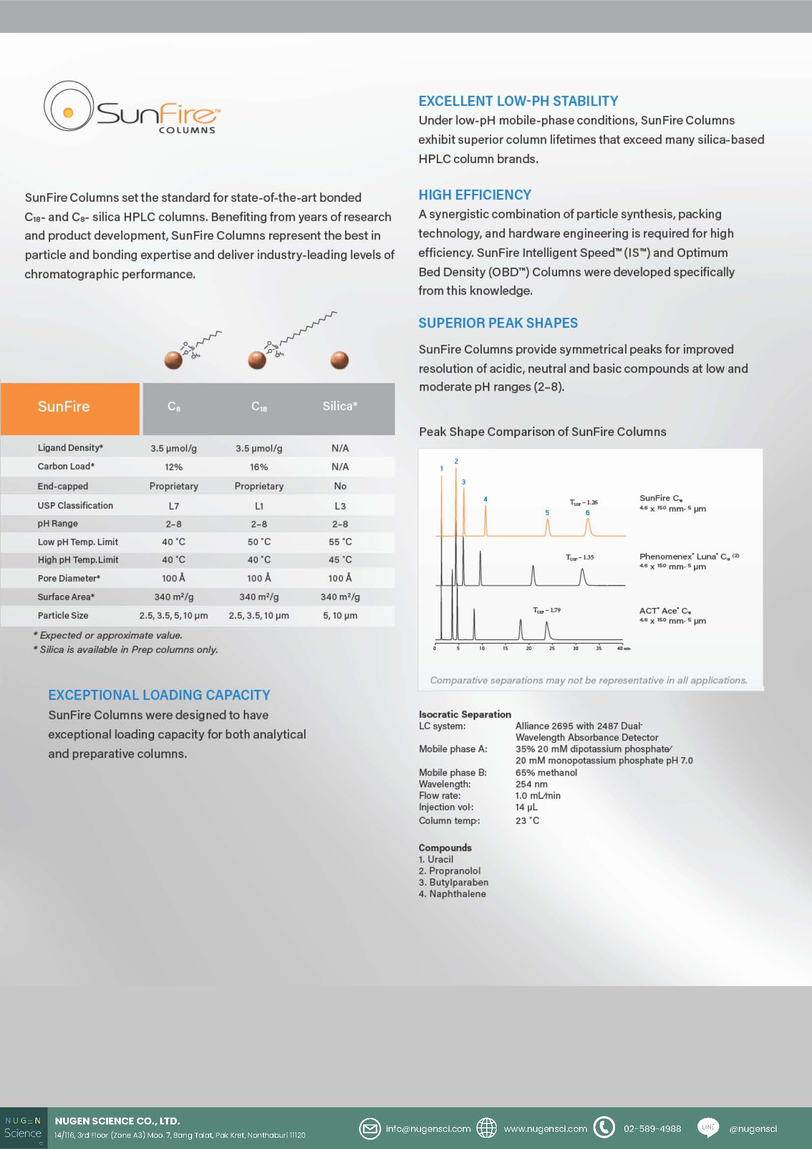 High efficiency at a low pH can be challenging. Waters SunFire HPLC Columns, available in analytical and preparative dimensions, help you do just that with state-of-the-art bonded silica designed for high mass loading, excellent low pH stability, superior peak shapes, and high efficiency.